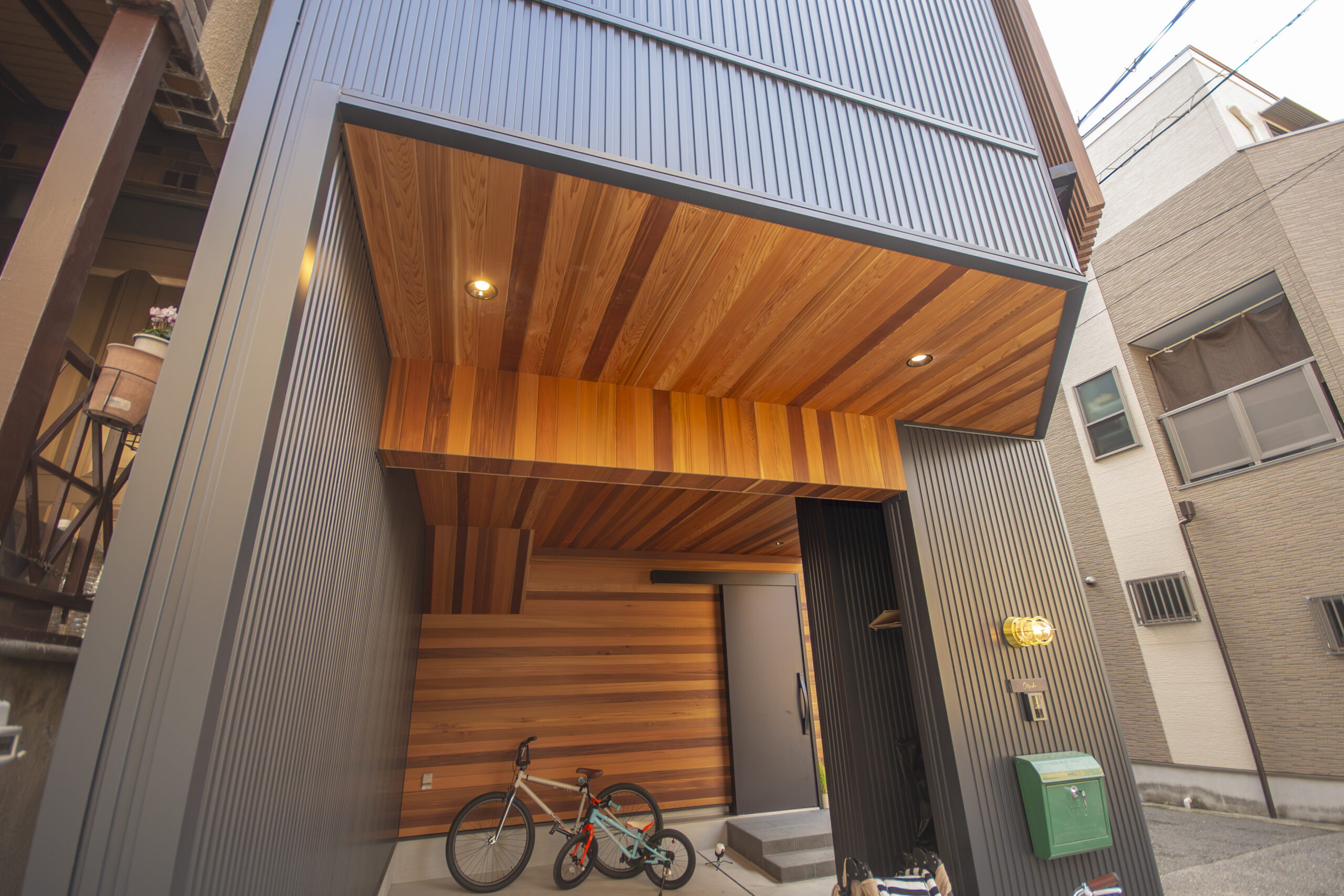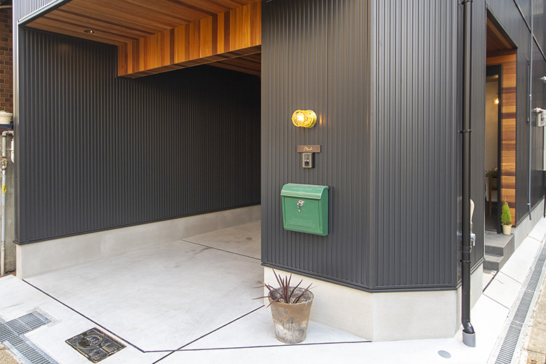 ガレージの壁をカットした壁面に、明るいグリーンが可愛らしい郵便受けを取り付けています。手元を明るく照らすマリンランプの相性も絶妙です。