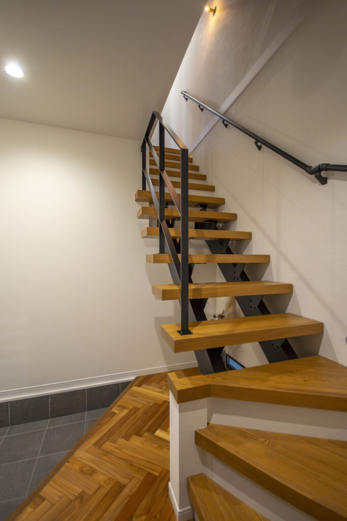 玄関を入り、2階へとつながる階段は「ストリップ階段」になっており開放的な空間を得られます。玄関の「上がり框」をあえて斜めにデザインしてあったり、床もヘリンボーン状にするなど、限られた空間を感じさせない工夫が散りばめられています。