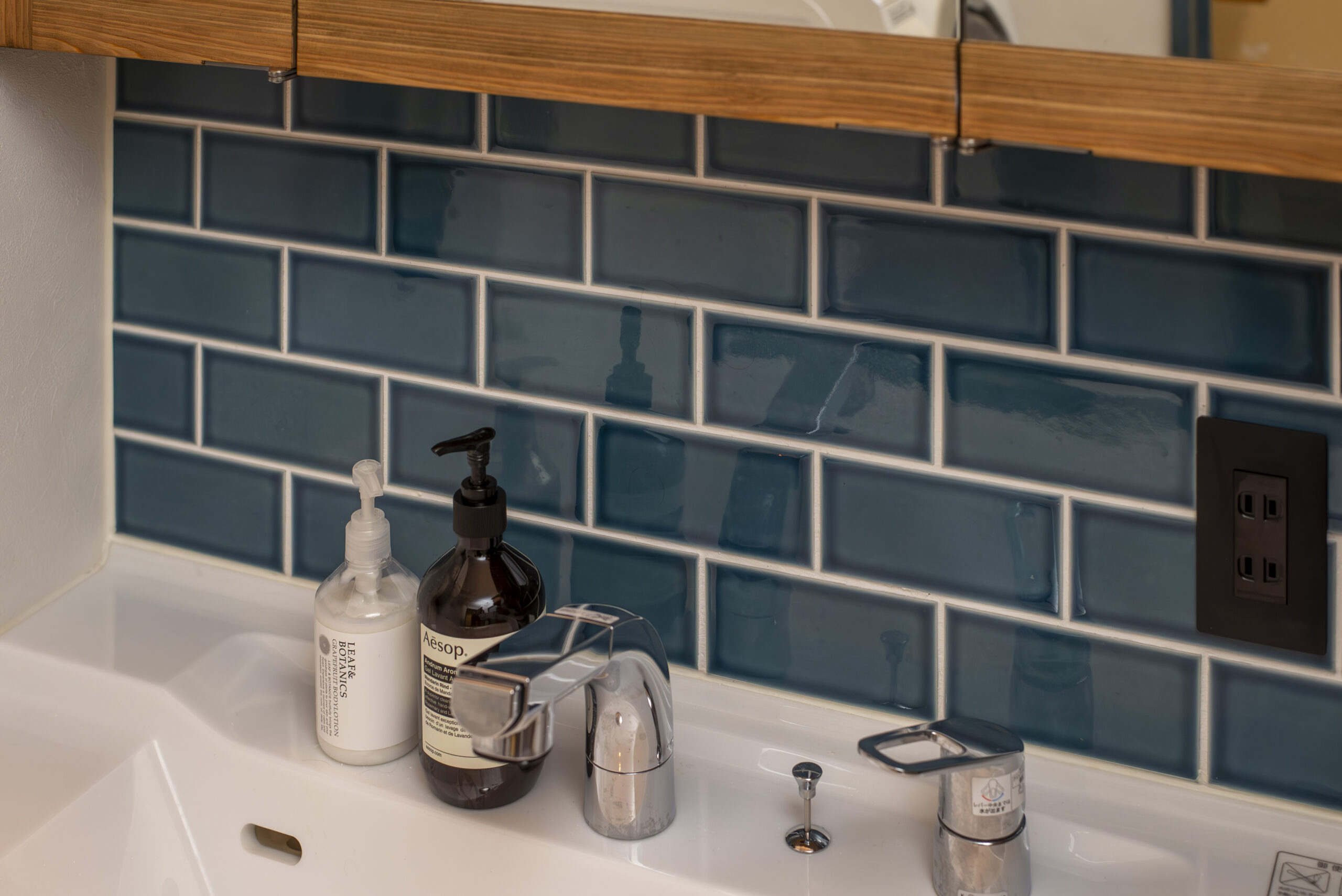 洗面室の扉、壁タイルもインテリアになじみながらも、さりげないアクセントになっています。