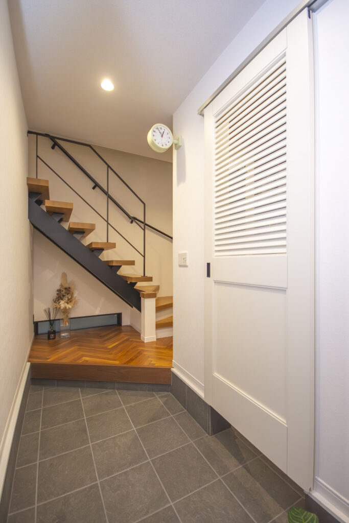 ルーパーが印象的な扉の向こうはシューズインクローゼットになっており、エントランスのアクセントに。ダブルフェイスのウォールクロックも印象的です。