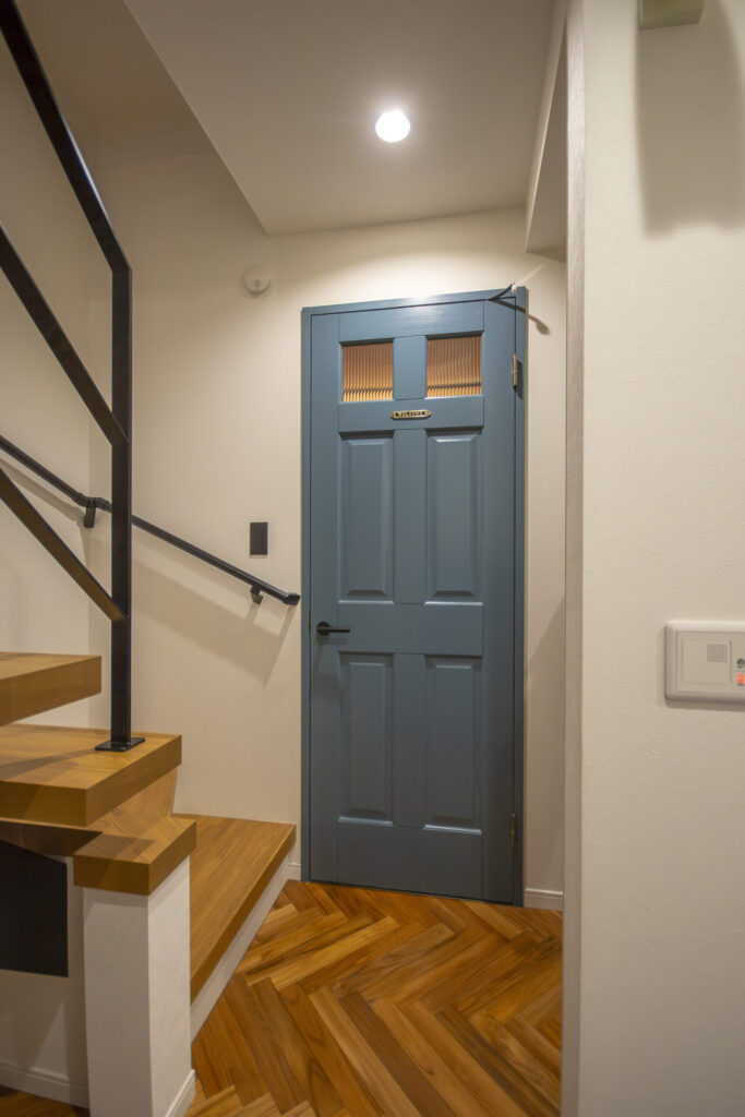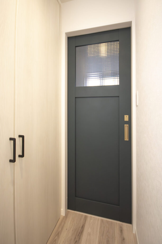 扉にもいろいろなこだわりが感じられます。トイレの扉は、上部だけをチェッカーガラスにしてあるので、採光が良くなり明るい印象になります。