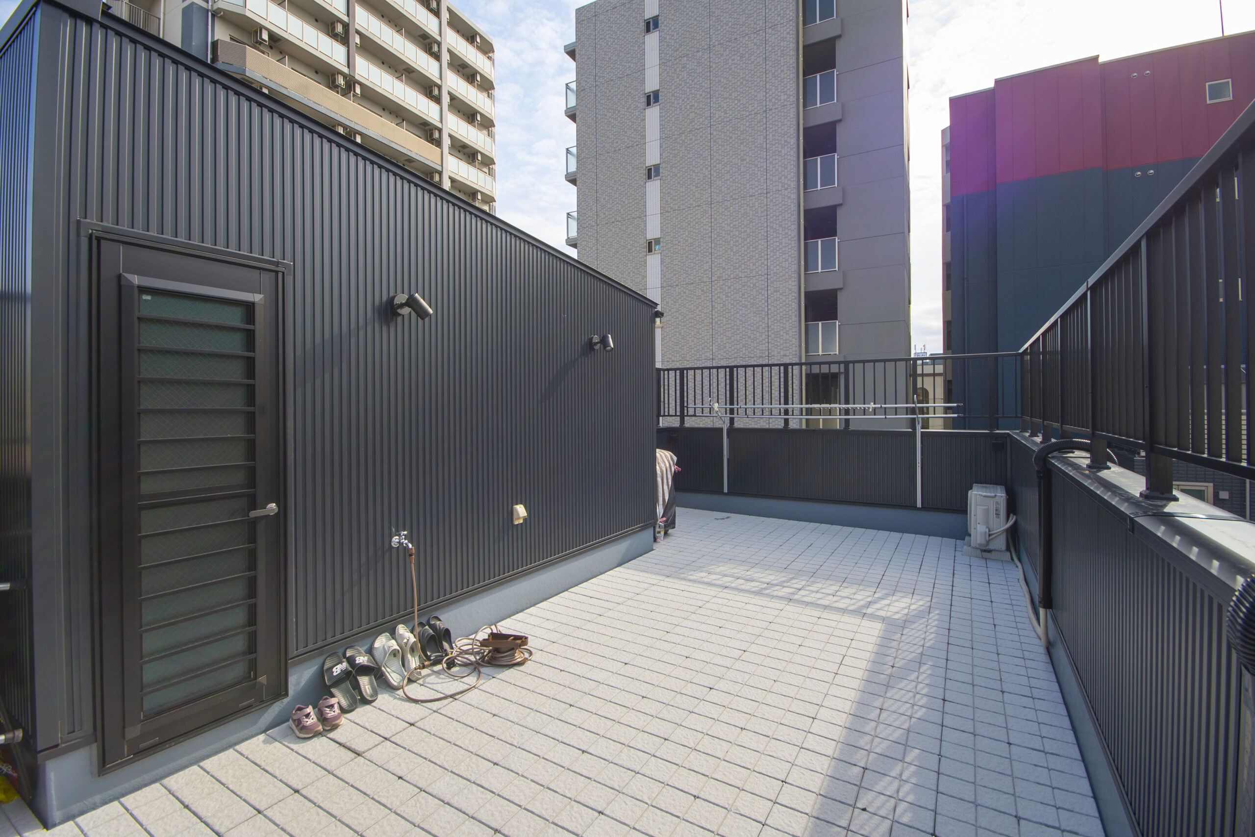 都心の住宅では、庭を設けることができないことが多いですが、ルーフバルコニーを屋上に作ることで、バーベキューやガーデニング、夏場はプールを広げて遊ぶなど様々な用途に使えます。お子様の安全を考えて手すり壁の上にフェンスを追加しました。