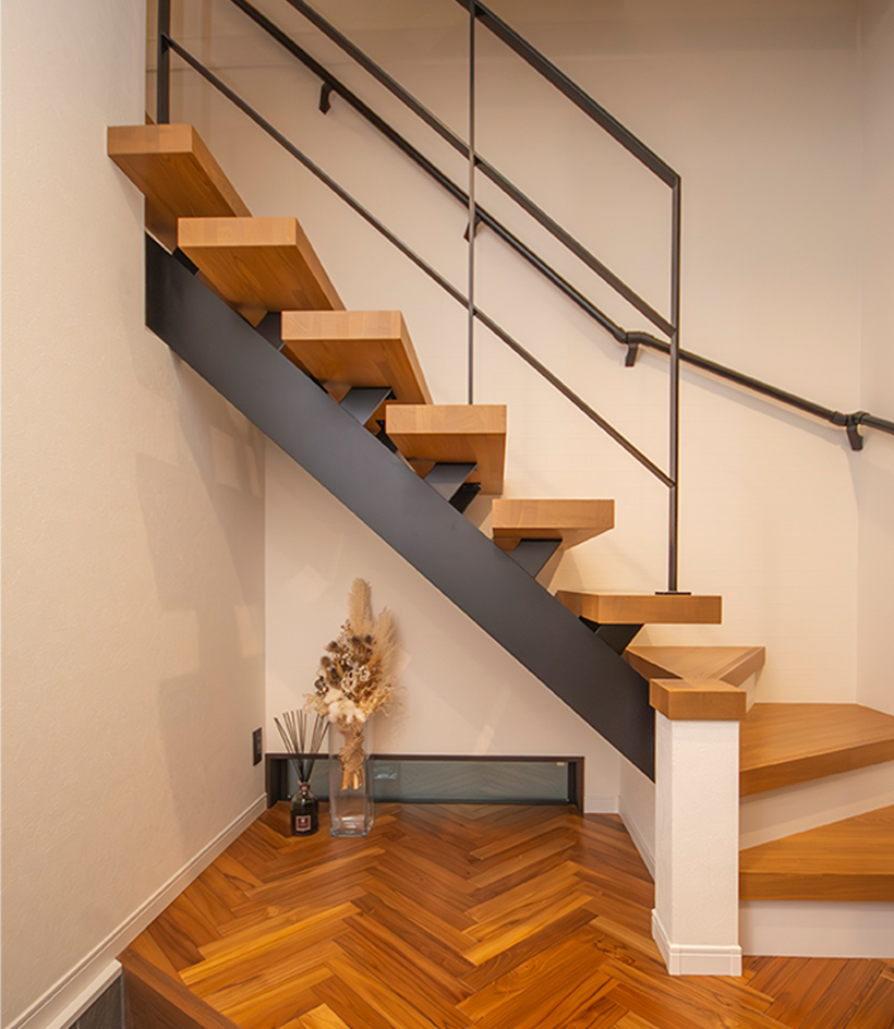 玄関を入り、2階へとつながる階段は「ストリップ階段」になっており開放的な空間を得られます。玄関の「上がり框」をあえて斜めにデザインしてあったり、床もヘリンボーン状にするなど、限られた空間を感じさせない工夫が散りばめられています。