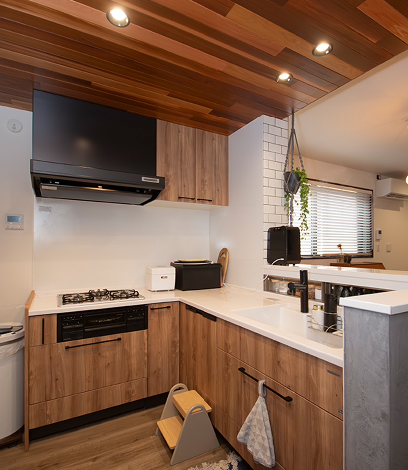 1階部分は、木目を大腿に使用してアクセントに したり、限られた空間を少しも無駄にしない、居心地の良い住まいが 実現しました。