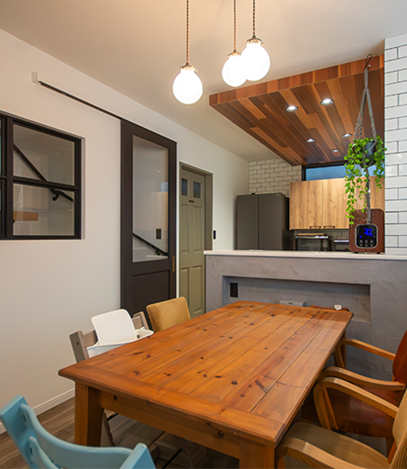 1階からストリップ階段を上がってくると、いったん扉がありLDKに入ります。解放感があるのでリビングに階段を直結するのも検討されましたが、小さいお子様に配慮にて壁と扉を設けました。その代わりに室内窓を設けたので、他にはないユニークな表情のリビングになりました。
