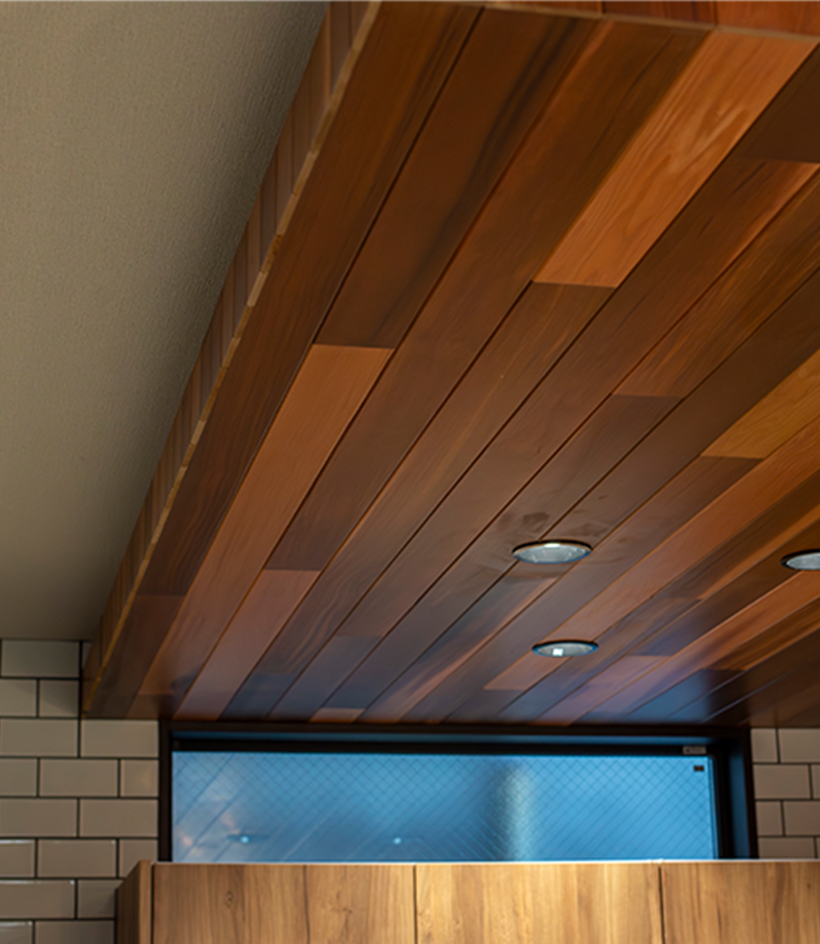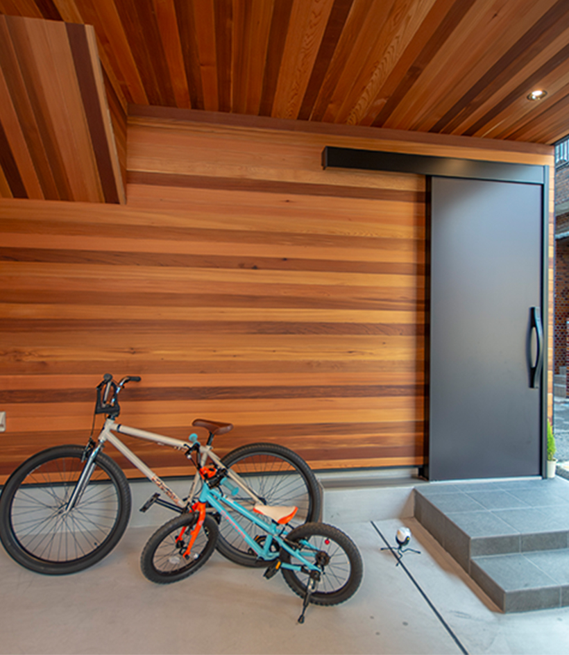 ガレージの天井や壁の一部は、木目がアクセントとなった「軒天」となっています。全て本物の木材を使用しているので、天然のやさしい風合いを感じることができます。