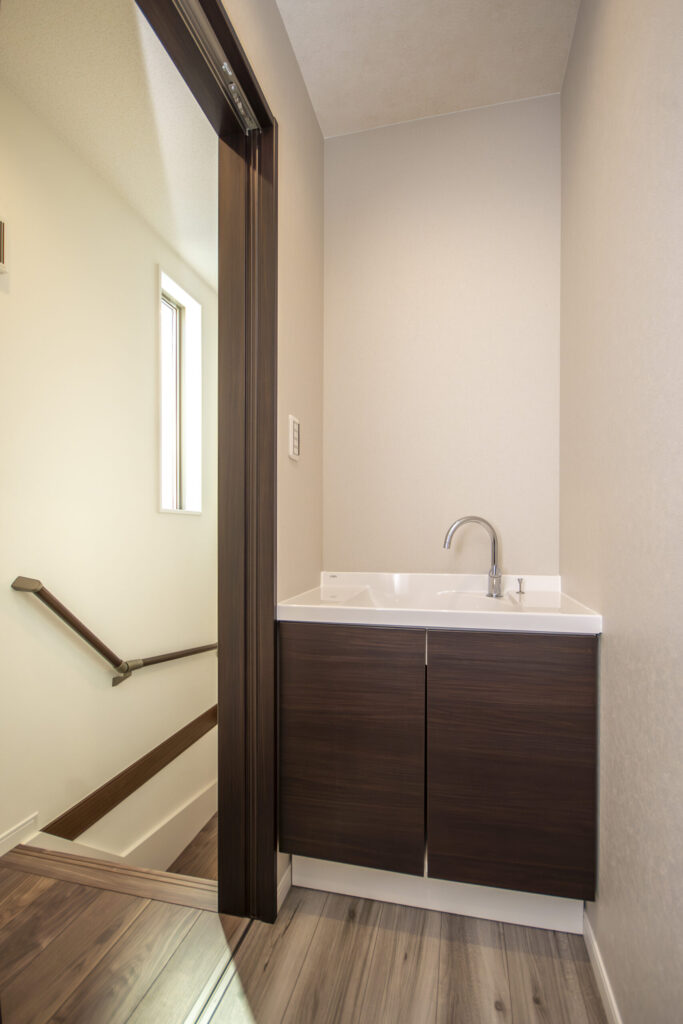 階段を上がってすぐの場所に手洗い場を設けました。外出から帰ってきた時の手洗いを習慣にできます。