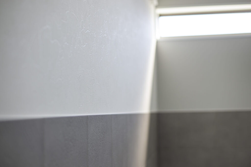 Y様は自身の健康上の理由と、将来的に家の中で動物と暮らしたいという思いがあり、人間や動物への影響が少ない壁紙や仕様で家の中を設計しました。抗菌・消臭効果があるとされる漆喰壁を採用したり、「環境アレルゲン」を抑制するタイルをお部屋や玄関に使用し、人間にも動物にもやさしいお家が完成しました。
