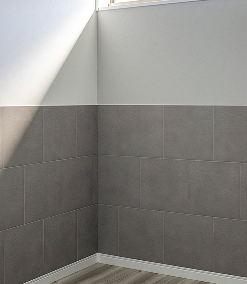 Y様は自身の健康上の理由と、将来的に家の中で動物と暮らしたいという思いがあり、人間や動物への影響が少ない壁紙や仕様で家の中を設計しました。抗菌・消臭効果があるとされる漆喰壁を採用したり、「環境アレルゲン」を抑制するタイルをお部屋や玄関に使用し、人間にも動物にもやさしいお家が完成しました。
