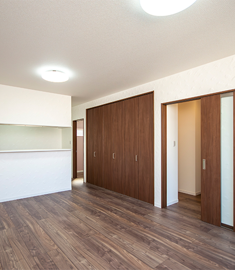 1階、8帖ある広めの洋室は、壁が全面漆喰の塗り壁になっています。漆喰独特の風合いが感じられるだけでなく、抗菌・消臭効果も期待できるので、長く過ごす部屋をクリーンな空間に保ちます。