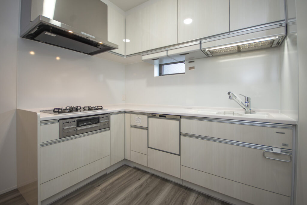 2階のキッチンはスペースを有効活用できるL字型のキッチンを採用。またシンクの上部には引き出して使える収納や仮置きスペースがあり、扉も1階と同様のハイドア仕様となっています。