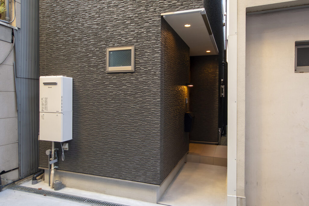 玄関は表通りから距離をおいて、建物の側面から出入りする位置にあり、プライバシーが守られるように配慮してあります。