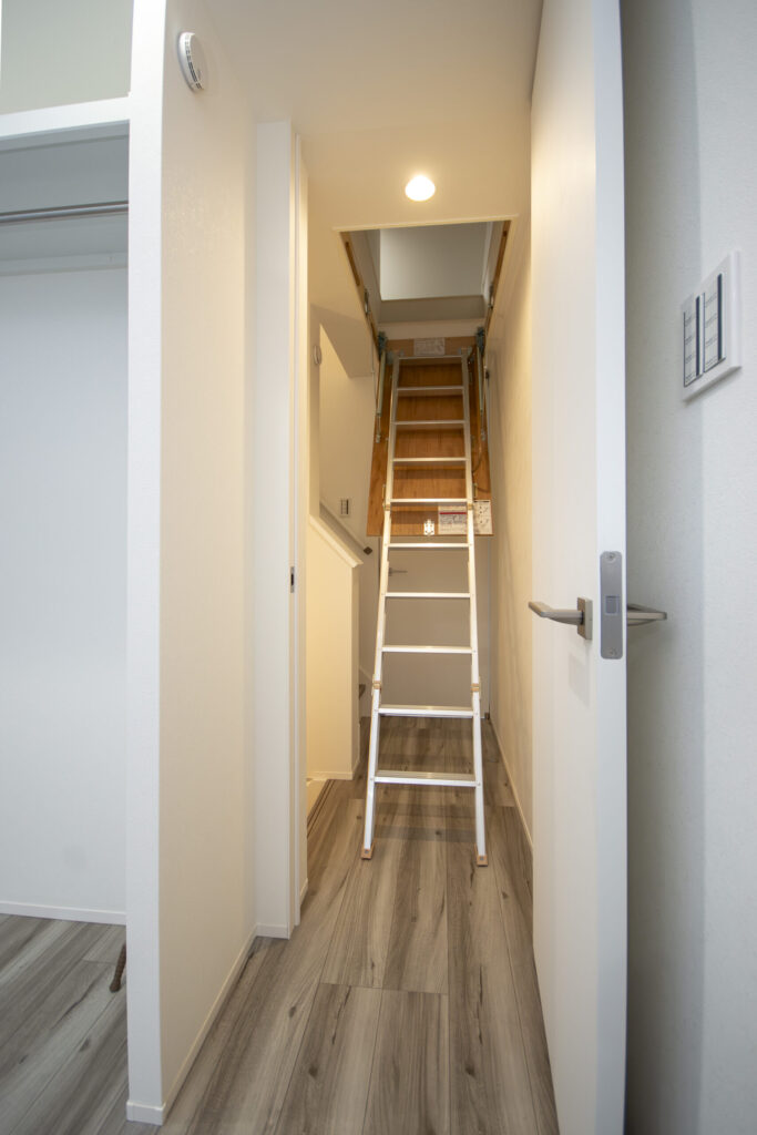 収納スペースの少なさを解消するために、3階には小屋裏収納を設けました。通常はハシゴをしまっておくことができます。