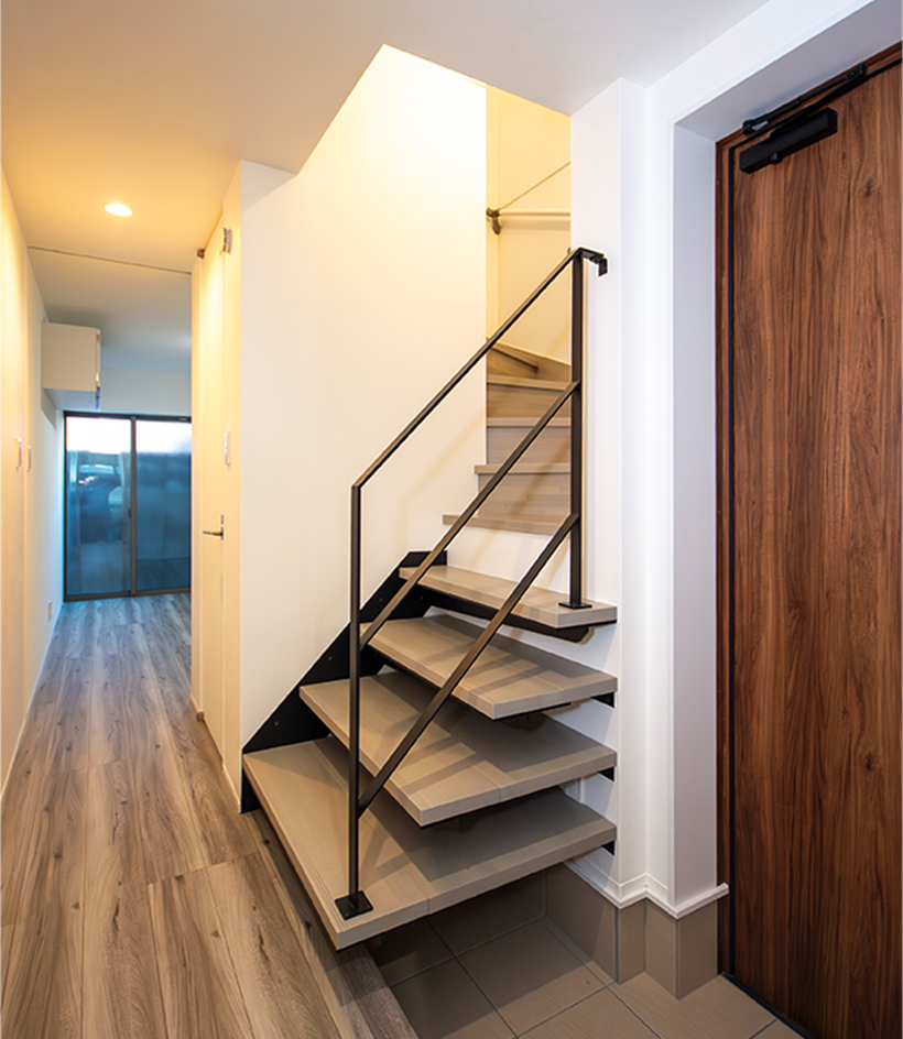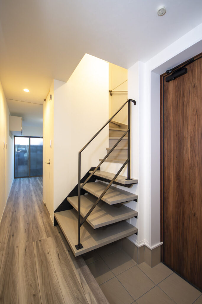 エントランスはスペースを最大限に生かすため最初の4段を「片持ち階段」仕様にしてあり、アイアンの手すりによる見た目のユニークさだけでなく、階段の壁を作らないので開放的な印象となります。