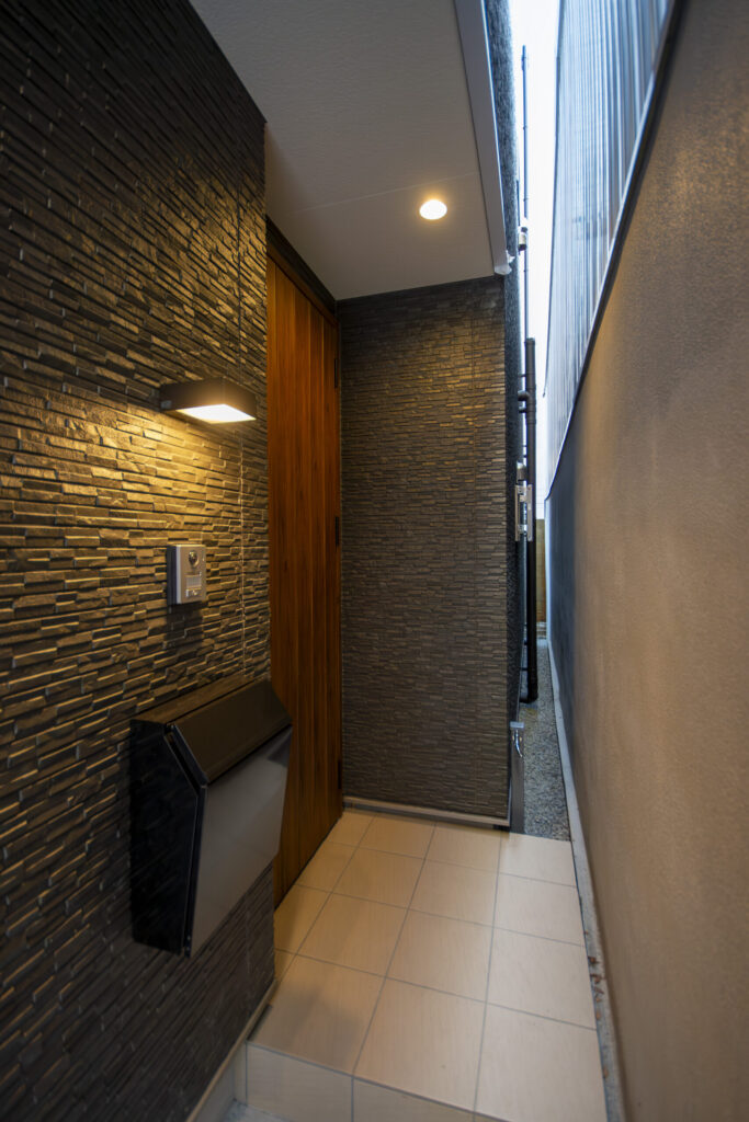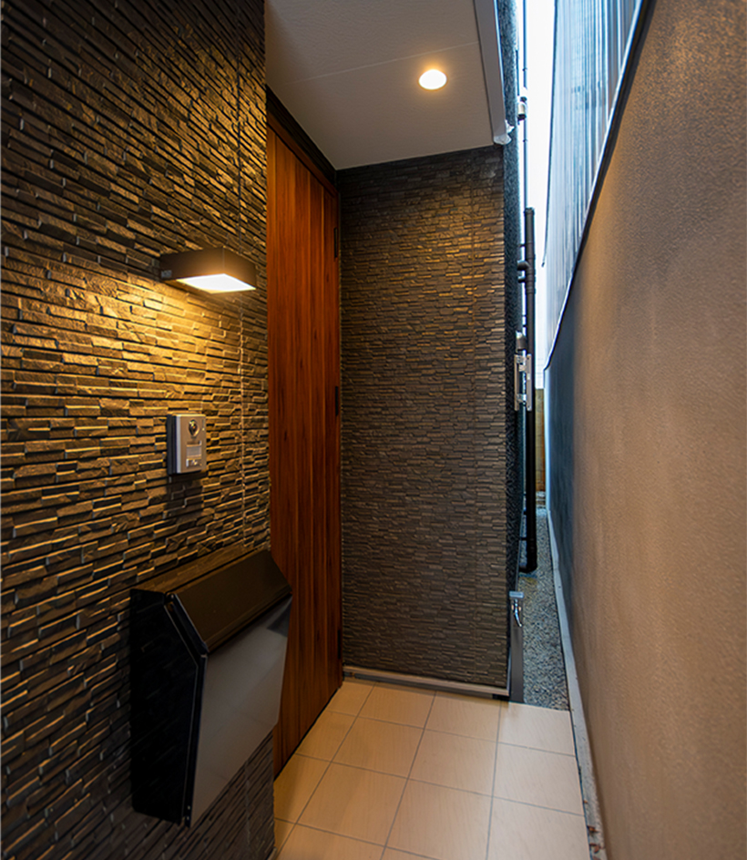 人通りのある道から少し離れた場所にある玄関。効果的に配慮したダウンライトで、エントランスアプローチを明るく照らします。