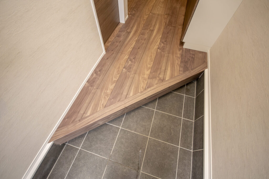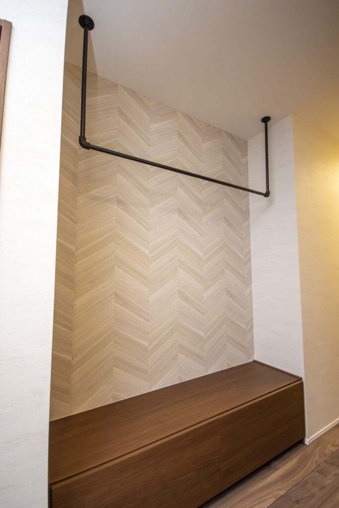 「上がり框」を斜めにして、玄関スペースを広く使えるよう工夫しました。向かって左側にはハンガーパイプを設置し、お客様が来られた際に上着などをかけておけるようにしました。