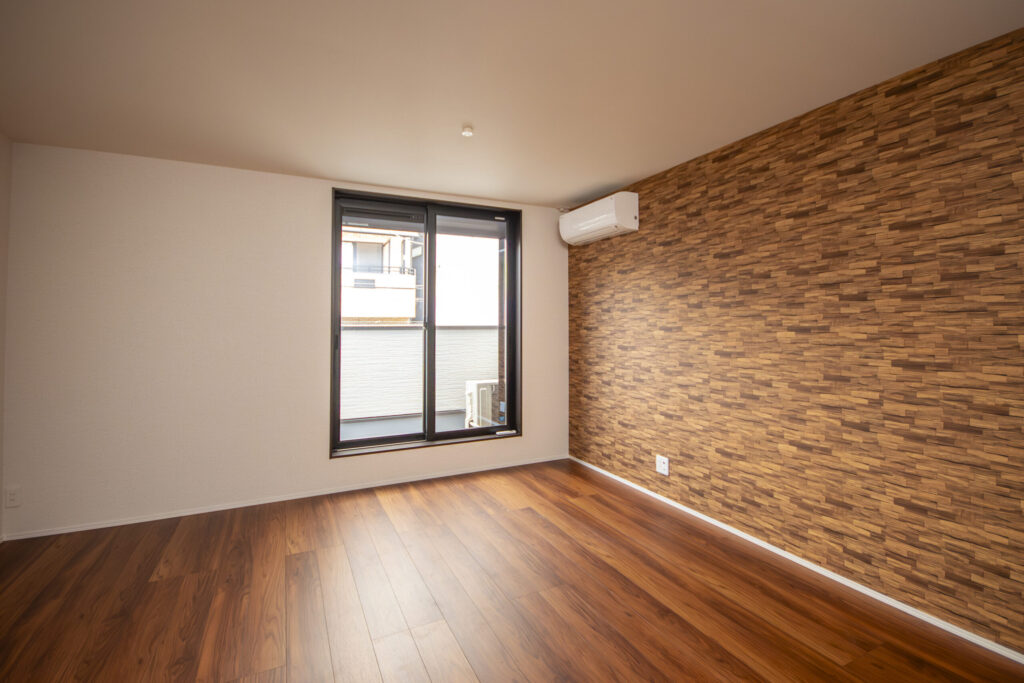 洋室は10.3帖の広々空間。木目調のアクセントクロスが印象的です。