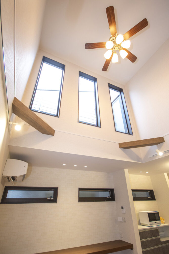 1階LDKは、天井が2階の高さまである「吹き抜け」になっています。「吹き抜け」は開放的な空間になる反面、空調が効きにくくなることがあります。この家は窓のサッシや断熱材を厚くすることで断熱性能を上げ、さらに床暖房も取り入れることで、「開放的な空間」と「空調の効きやすさ」を両立させました。