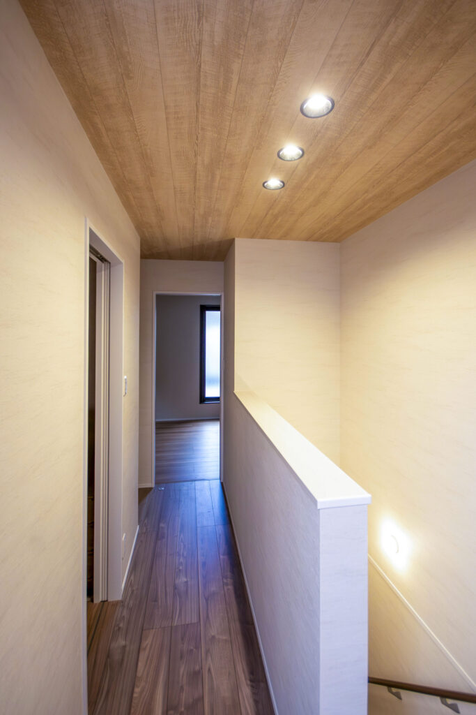 2階の階段ホールは、階段上部の空間が広く抜けているので、壁がある状態と比べて開放的な印象をもたらします。階段ホールの照明はダウンライトを使用しており、天井がフラットになっているので、凹凸がなく空間がスッキリとした印象になります。