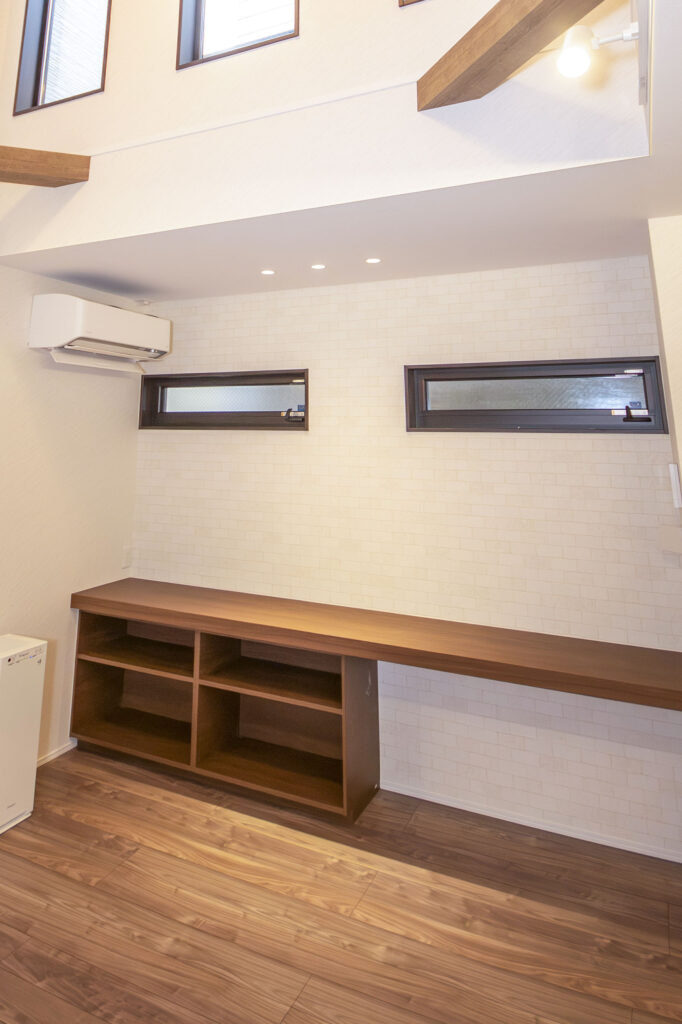 LDKの窓際にはカウンターや収納棚を設けてあり、スペースをムダなく活用できます。窓があるので採光もよく、手元を照らしてくれるライトもあるので、読書や書き物もできます。