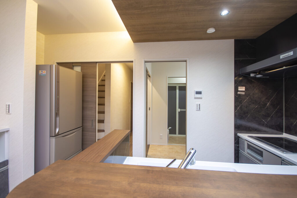 写真の手前がキッチン、向かって右側が洗面室、左側が廊下になっています。洗濯をする洗面室からキッチンへのアクセスがしやすく、日々の家事が効率的にできます。