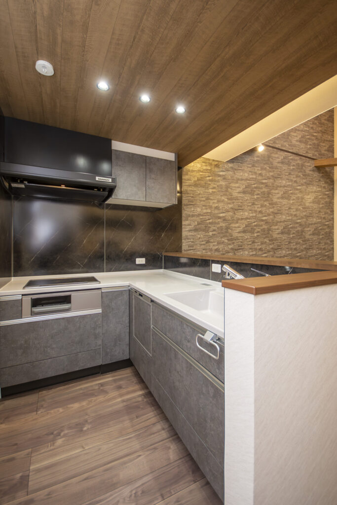 建物の広さに限りがあるので、空間を有効に使えるL字型キッチンを採用しました。洗面室へは廊下とキッチンから入れる2WAY動線。お料理の合間にお洗濯もできます。