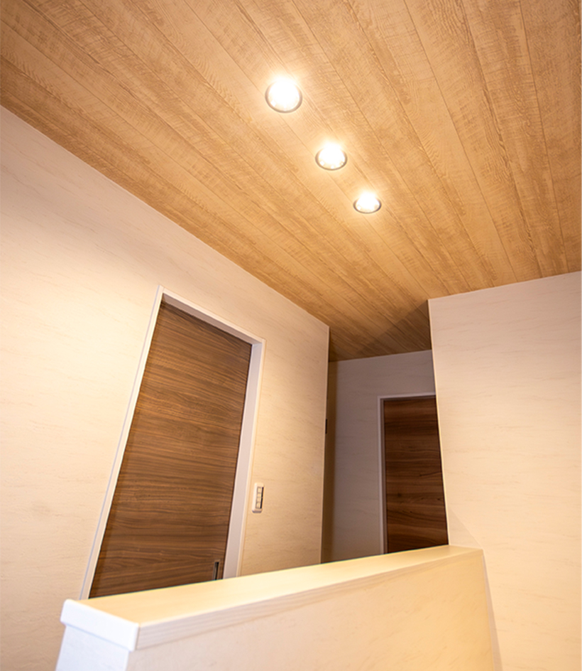 2階の階段ホールは、階段上部の空間が広く抜けているので、壁がある状態と比べて開放的な印象をもたらします。階段ホールの照明はダウンライトを使用しており、天井がフラットになっているので、凹凸がなく空間がスッキリとした印象になります。