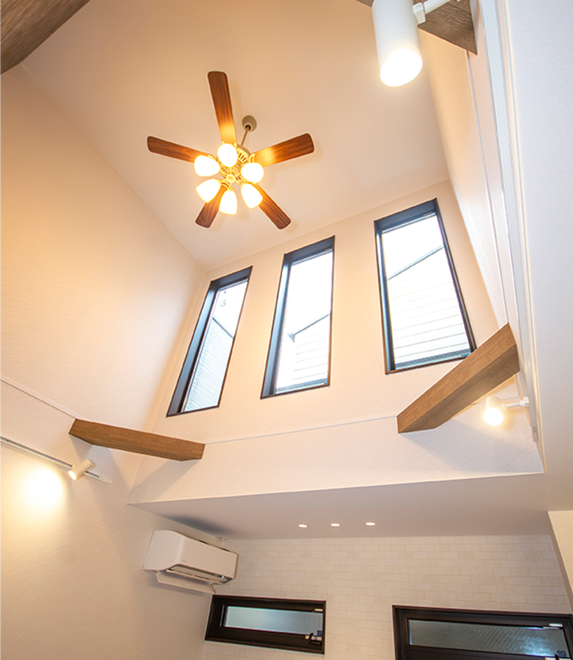 1階LDKは、天井が2階の高さまである「吹き抜け」になっています。「吹き抜け」は開放的な空間になる反面、空調が効きにくくなることがあります。この家は窓のサッシや断熱材を厚くすることで断熱性能を上げ、さらに床暖房も取り入れることで、「開放的な空間」と「空調の効きやすさ」を両立させました。
